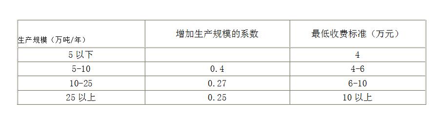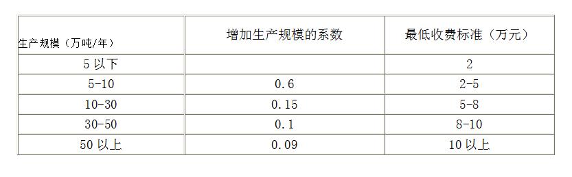 4.生產規模在區間內的項目評價費=收費標準+(項目的生產規模-表中相應的生產規模下限)×增加生產規模的系數。